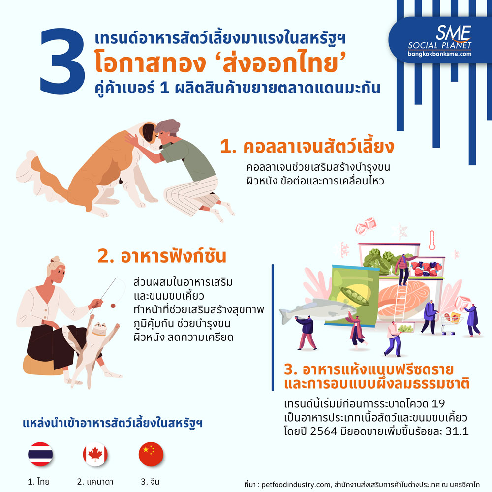 ขณะนี้เกิด 3 เทรนด์อาหารสัตว์เลี้ยงกำลังเป็นกระแสมาแรงในประเทศสหรัฐอเมริกา ดังนั้น Bangkok Bank SME จึงขอนำรายละเอียด 3 เทรนด์ดังกล่าวมาให้ได้ทราบ เพื่อเป็นอีกหนึ่งตัวช่วยผู้ประกอบการและ SME ไทย ในฐานะคู่ค้าเบอร์ 1 สู่การผลิตสินค้าขยายตลาดแดนมะกันตอบโจทย์ความต้องการอย่างตรงจุด คว้าโอกาสทองนี้ไว้ให้ได้
