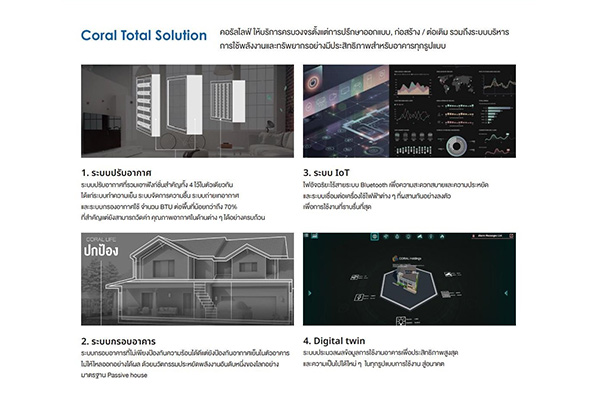 ส่วนงานระบบปรับอากาศ จะมีเทคโนโลยีในการรวม 4 ฟังก์ชั่นไว้ในเครื่องเดียวกัน ได้แก่ การทำความเย็น ควบคุมความชื้น ถ่ายเทอากาศ และกรองอากาศ ซึ่งปกติระบบแบบนี้จะมีเฉพาะอาคารใหญ่เท่านั้น เช่น อาคารสำนักงาน โรงแรมขนาดใหญ่ โรงพยาบาลขนาดใหญ่ แต่ ‘Coral Life’ ทำได้ทุกขนาดของอาคาร ตั้งแต่บ้านไปจนถึงอาคารขนาดใหญ่