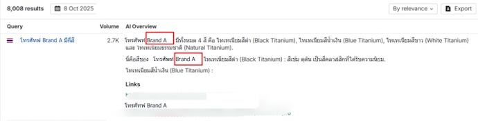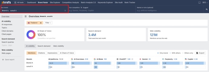 โดย Brand Radar เป็นฟีเจอร์ที่ใช้งานง่าย เพียงใส่ชื่อ Brand ของคุณไม่ว่าจะเป็น ชื่อเต็ม, ชื่อภาษาอังกฤษ หรือชื่อย่อ เพื่อดูว่า AI มีการ Mention ถึงแบรนด์คุณมากแค่ไหนในแต่ละ Platform เช่น “Brand A”