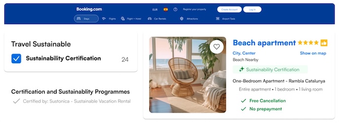 โรงแรมที่มีใบรับรองด้านความยั่งยืนจะปรากฏในฟิลเตอร์หรือหมวด “ที่พักยั่งยืน/เป็นมิตรกับสิ่งแวดล้อม” ซึ่งเป็นจุดที่นักท่องเที่ยวที่สนใจเรื่องนี้จะเลือกดูเป็นหลัก นอกจากนี้ Travel Sustainable Badge ยังช่วยดึงดูดความสนใจบนหน้าโปรไฟล์ของโรงแรมได้อีกด้วย