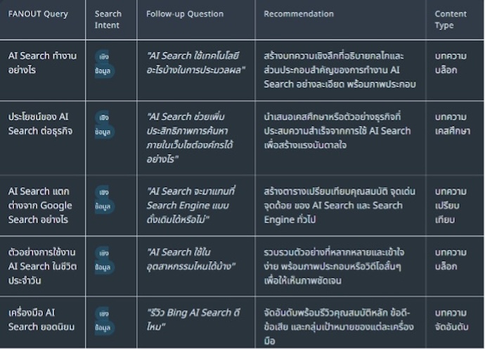 โดยเมื่อพิมพ์ Keyword ไปแล้ว Tools จะจำลองการทำงาน Query Fan-Out เพื่อเอาไปใช้ในการเขียน Content ที่มี Topic ที่ครอบคลุมมากขึ้นได้ ทำให้มีโอกาสสูงขึ้นที่ AI จะเข้ามาเจอเราผ่าน Sub-Query ต่าง ๆ ช่วยให้เพิ่มโอกาสติด AI Search มากขึ้น