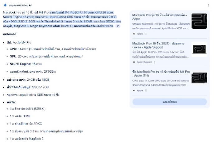 “MacBook Pro รุ่น 16 นิ้ว ชิป M4 Pro มาพร้อมชิป M4 Pro (CPU 14-core, GPU 20-core, Neural Engine 16-core) บนจอภาพ Liquid Retina XDR ขนาด 16 นิ้ว, หน่วยความจำ 24GB หรือ 48GB, SSD 512GB, พอร์ต Thunderbolt 5 จำนวน 3 พอร์ต, HDMI, ช่องเสียบ SDXC, ช่องต่อหูฟัง, MagSafe 3, Magic Keyboard พร้อม Touch ID, และอะแดปเตอร์แปลงไฟ 140W...” พร้อมใส่แหล่งอ้างอิงจากเว็บไซต์ที่น่าเชื่อถือไว้ด้านข้างตามตัวอย่างด้านล่าง
