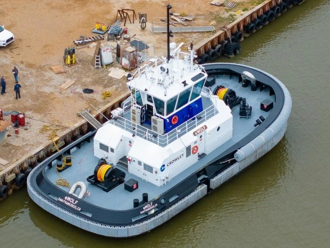 ด้วยเหตุนี้ บริษัท Crowley ในสหรัฐอเมริกา จึงพัฒนา eWolf เรือลากจูงไฟฟ้า 100% เพื่อรองรับเรือขนาดใหญ่ที่จอดเทียบท่าในสหรัฐอเมริกา โดยเริ่มดำเนินการที่ท่าเรือในปี 2024 คาดว่าจะช่วยลดการปล่อยก๊าซไนโตรเจนออกไซด์ได้ 178 ตัน ลดการปล่อยฝุ่นควันที่เกิดจากการเผาไหม้น้ำมันดีเซลได้ 2.5 ตัน และลดการปล่อยก๊าซคาร์บอนไดออกไซด์ (CO2) ได้ถึง 3.100 เมตริกตัน ซึ่งเทียบเท่าการลดการใช้น้ำมันกว่า 1.32 ล้านลิตร ตามการคำนวณของกรมควบคุมมลพิษ และตามการคำนวณของ EPA การลดลงนี้เทียบเท่ากับการขจัดก๊าซมลพิษต่าง ๆ ที่กล่าวมาข้างต้นมากถึง 350,000 แกลลอนออกจากการใช้งาน เมื่อเทียบกับการลากจูงทั่วไป ซึ่งลดผลกระทบต่อสิ่งแวดล้อมได้สูงมากเลยทีเดียว