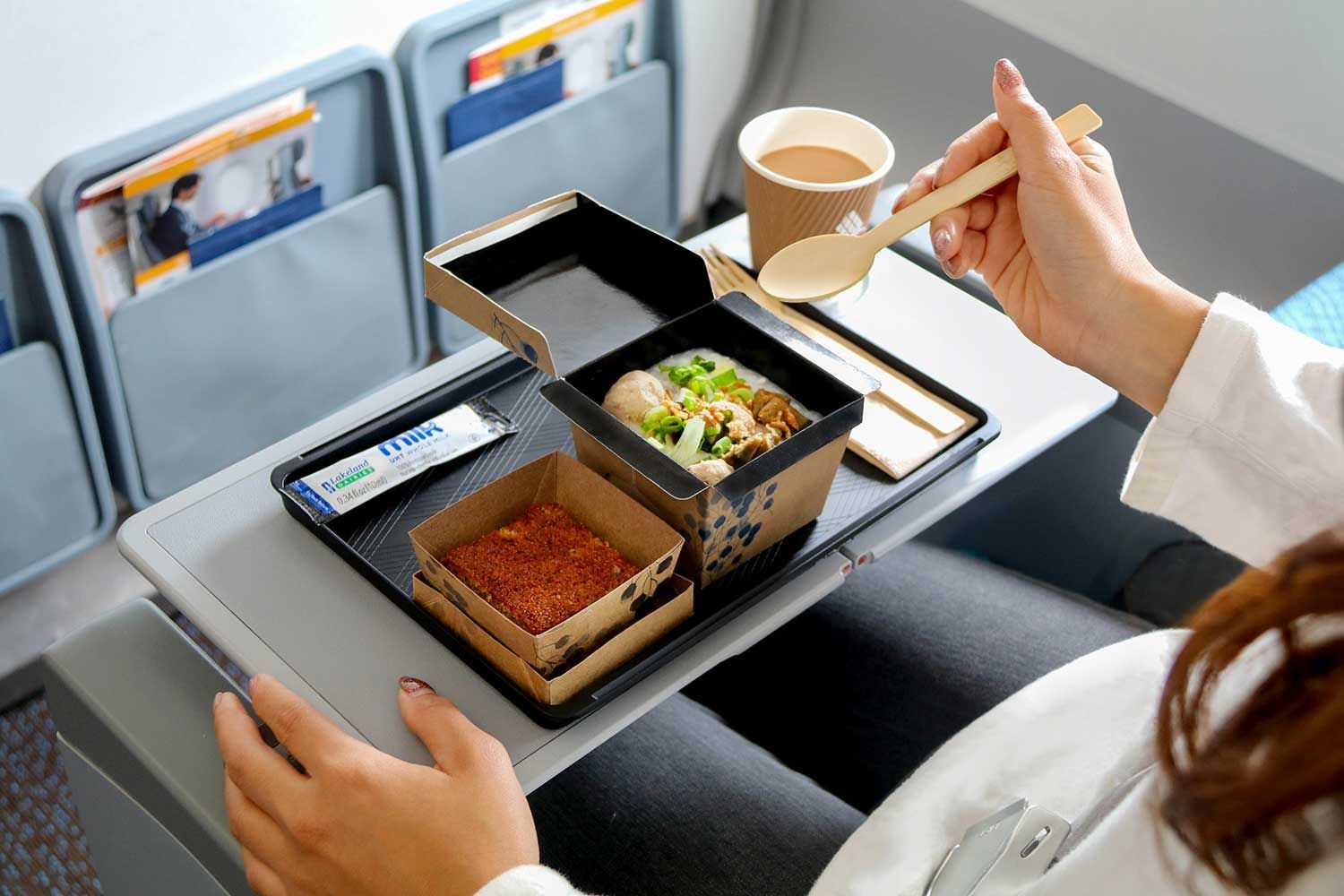 นอกจากนี้ภาชนะใส่อาหารที่ให้บริการผู้โดยสารบนเครื่องบินก็มีส่วนสำคัญในการช่วยลดโลกร้อนไม่แพ้กัน อย่างเช่น สายการบิน SINGAPORE AIRLINES ทดลองใช้ภาชนะบรรจุอาหารกระดาษที่ผ่านการรับรองจากองค์กรพิทักษ์ป่าไม้ (Forest Stewardship Council หรือ FSC)