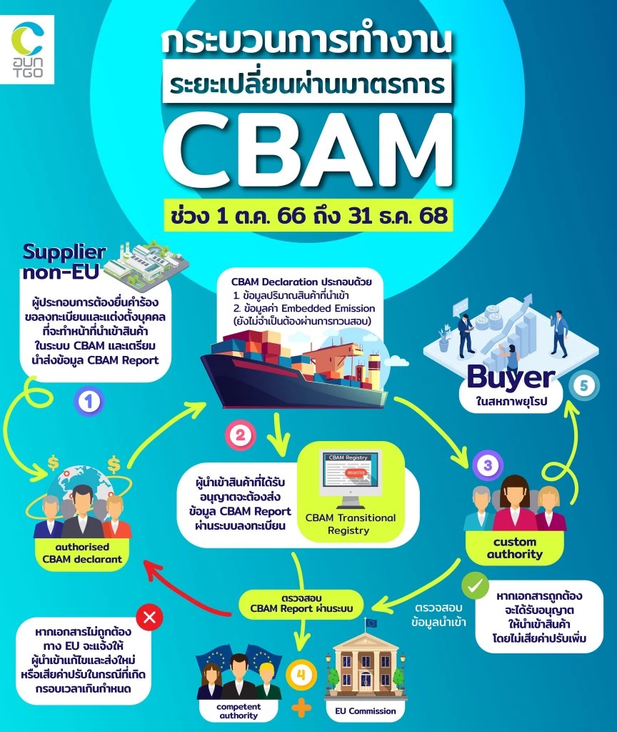 - ผู้ประกอบการไทยที่ผลิตสินค้าให้ประเทศอื่น ๆ นอก EU ต้องประสานผู้นำเข้าสินค้าที่ขึ้นทะเบียนอย่างถูกต้องเป็น CBAM Declarant ในระบบ CBAM Registry เพื่อรายงานข้อมูลต่าง ๆ ตามที่มาตรการ CBAM กำหนด
