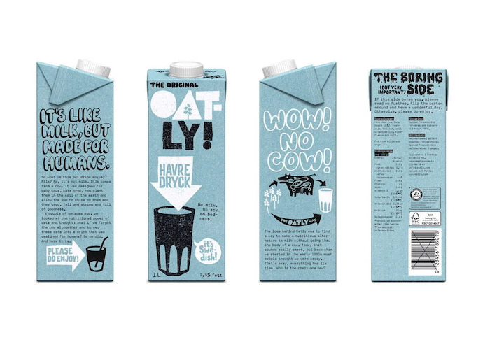 Oatly แบรนด์นมข้าวโอ๊ตจากสวีเดน ที่บรรจุภัณฑ์เป็นกล่องกระดาษ Eco-Friendly Packaging ที่ได้รับการรับรอง FSC ซึ่งหมายถึง กระดาษที่มีมาจากป่าที่มีการจัดการอย่างยั่งยืน และแบรนด์ยังใช้วัสดุรีไซเคิลร่วมกับวัสดุที่นำกลับมาใช้ใหม่สูงถึง 90% รวมถึงการลดน้ำหนักของบรรจุภัณฑ์ลงด้วย นอกจากนี้ แบรนด์ยังสื่อสารเรื่องความยั่งยืนอย่างตรงไปตรงมาผ่านการออกแบบบรรจุภัณฑ์ที่ไม่เหมือนใครเข้าถึงกลุ่มคนรุ่นใหม่ได้เป็นอย่างดี