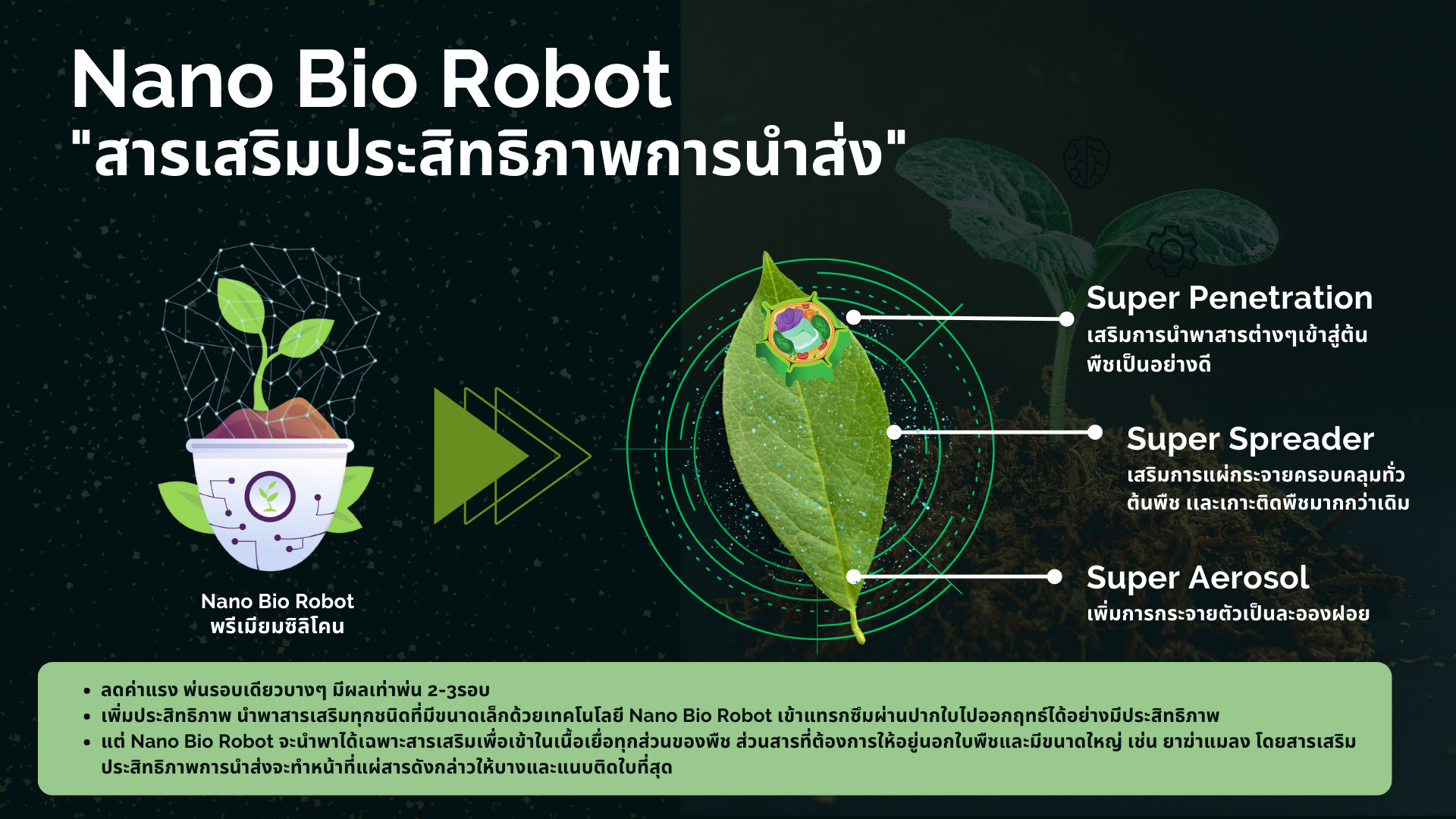 สำหรับเทคโนโลยีนาโนไบโอโรบอท ปัจจุบันนำมาใช้ในภาคการเกษตร ทั้งพืชและสัตว์ ตลอดจนการรักษาโรคที่เป็นนวัตกรรมการแพทย์ยุคใหม่ อาทิ การผลิตยา วัคซีน เพื่อการรักษาโรคอย่างมีประสิทธิภาพ ขณะที่ นาโนไบโอโรบอทที่เป็น Core Technology ของธุรกิจ รูปแบบเหมือนหุ่นยนต์ขนาดเล็กระดับนาโนเมตร สร้างขึ้นจากสารที่ย่อยสลายได้เองตามธรรมชาติ โดยใช้นาโนไบโอโรบอทห่อหุ้มสารสำคัญเพื่อป้องกันการสูญเสียระหว่างกระบวนการ