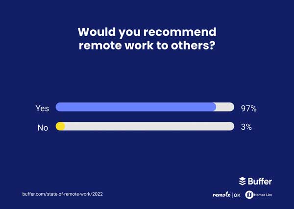 ส่วน Remote Working Report 2022 จัดทำโดย Buffer แพลตฟอร์มบริหารจัดการ Social Media โดยทำการสำรวจความคิดเห็นจาก Remote Workers หรือพนักงานที่ทำงานแบบรีโมทตัวจริงเสียงจริง จำนวน 2,118 คนทั่วโลก พบสถิติที่น่าสนใจ ดังนี้