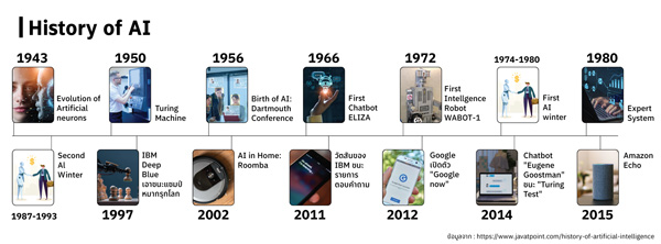 บทความนี้ เรามีภาคต่อของพัฒนาการของเทคโนโลยีเอไอ ที่ยังไม่จบ และยังโตไม่หยุด เริ่มด้วยการพาคุณผู้อ่านย้อนกลับไปดูจุดเริ่มต้นของ AI ตามข้อมูลของ Javatpoint โดยจัดแบ่งเป็นช่วงปี 8 ช่วง ดังนี้