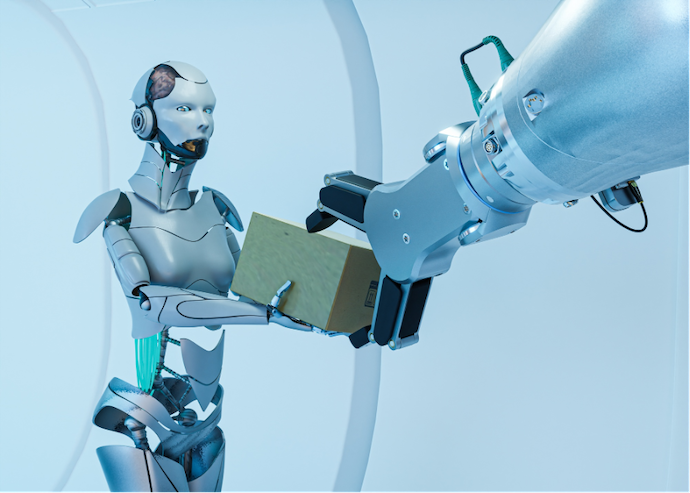 Humanoids ทำงานหยิบสินค้า → ส่งต่อให้สายการผลิตหรือบรรจุภัณฑ์