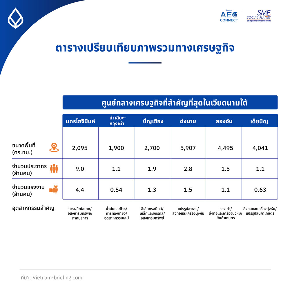 ‘เวียดนามใต้’ เป็นศูนย์กลางสำหรับกิจกรรมทางเศรษฐกิจที่สำคัญที่สุดของเวียดนาม สามารถสร้าง GDP คิดเป็นสัดส่วนถึง 40% และมูลค่าการลงทุนโดยตรงสะสมถึง 42% ซึ่งภูมิภาคนี้ได้มอบสภาพแวดล้อมทางธุรกิจที่มีพลวัตและหลากหลายต่อธุรกิจต่างๆ ตั้งแต่ธุรกิจ SMEs ไปจนถึงธุรกิจขนาดใหญ่ รวมทั้งยังมีทรัพยากรบุคคลที่มีคุณภาพดีที่สุดของประเทศอีกด้วย