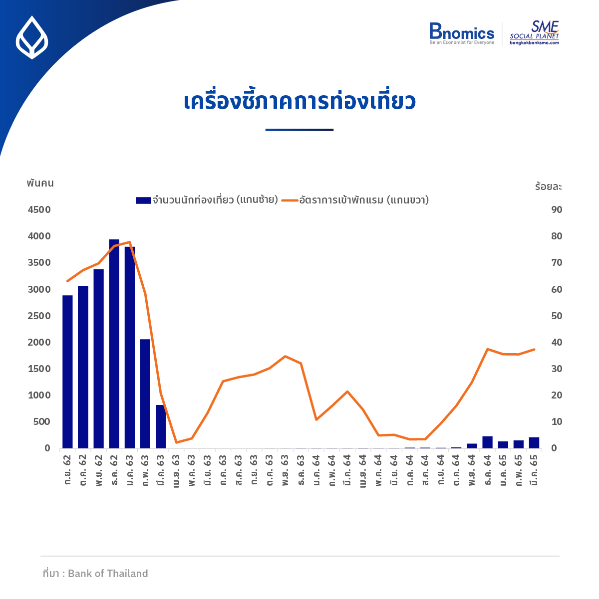 เครื่องชี้ภาคการท่องเที่ยวสำคัญอีกตัว ที่มีทิศทางเป็นบวกอย่างมาก คือตัวเลขอัตราการเข้าพักแรมทั่วประเทศ ที่แม้ตอนนี้นักท่องเที่ยวชาวต่างชาติจะพึ่งกลับเข้ามาประมาณ 1 ใน 10 แต่อัตราการเข้าพักแรมทั่วประเทศในข้อมูลเดือนล่าสุด ก็กลับเข้าสู่ระดับร้อยละ 37.43