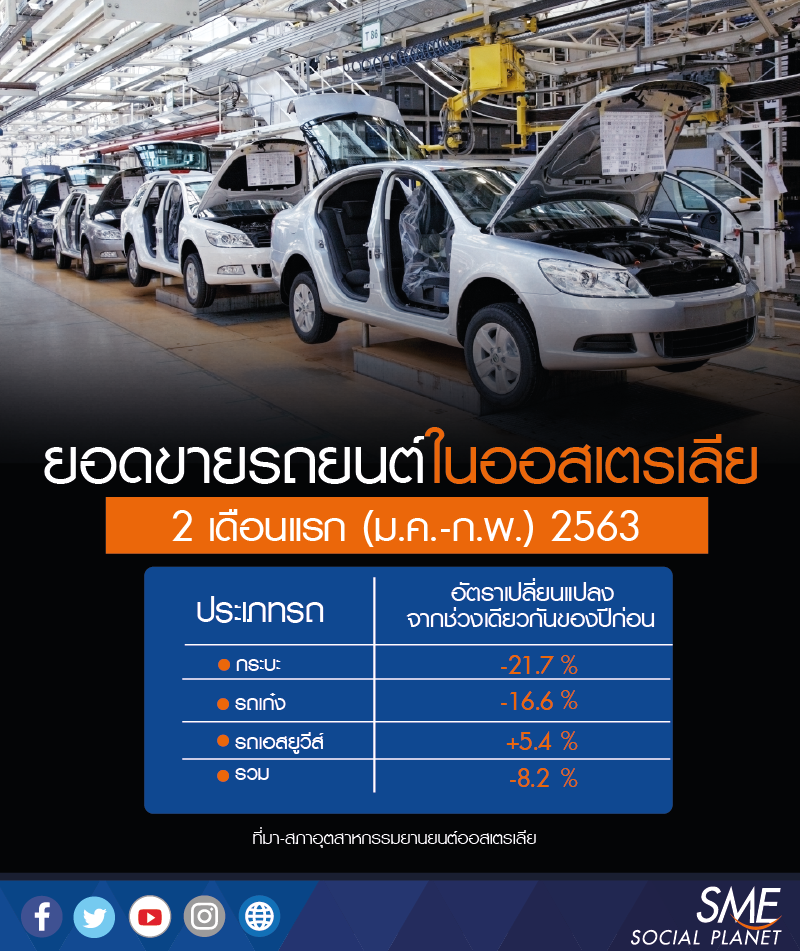 ผู้บริโภคชะลอการจับจ่ายใช้สอย โดยเฉพาะการซื้อสินค้าที่มีราคาสูงอย่างรถยนต์ ซึ่งตามข้อมูลของสภาอุตสาหกรรมยานยนต์ออสเตรเลีย ระบุว่ายอดขายรถยนต์ใหม่ในออสเตรเลียในเดือนกุมภาพันธ์ 2563 มีจำนวน 79,940 คัน ปรับลดลง 8.2% ซึ่งเป็นการปรับตัวลดลงต่อเนื่องเป็นเดือนที่ 23 และส่งผลให้ยอดขายช่วง 2 เดือนแรก (ม.ค.-ก.พ.) 2563 มีจำนวน 151,671 คัน ซึ่งเป็นการปรับลดลงของรถทุกประเภท ทั้งรถกระบะ รถเก๋ง รถเอสยูวีส์