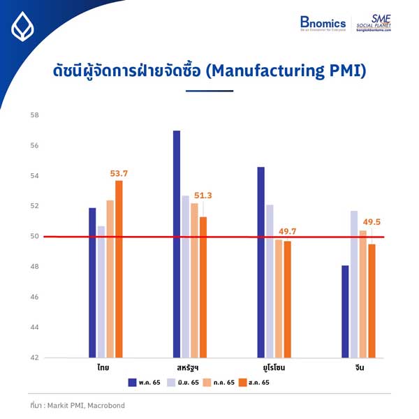 แม้ดัชนีภาคการบริโภคอาจจะชะลอตัวลงเล็กน้อย แต่ภาคการผลิตของไทยยังเติบโตได้ดีต่อเนื่อง โดยดัชนีผู้จัดการฝ่ายซื้อภาคอุตสาหกรรม (Manufacturing PMI) ในเดือนสิงหาคมของไทยฟื้นตัวต่อเนื่องจากเดือนก่อน มายืนอยู่ที่ระดับ 53.7 ซึ่งเป็นระดับที่สูงกว่าก่อนช่วงก่อนการแพร่ระบาดของโควิด-19 เสียอีก