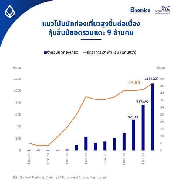 โดยข้อมูลจำนวนนักท่องเที่ยวต่างชาติล่าสุด ในเดือนกรกฎาคม เพิ่มขึ้นมาอยู่ที่ระดับ 1.1 ล้านคนต่อเดือน เป็นการปรับขึ้นต่อเนื่องเป็นเดือนที่ 6 ติดต่อกัน ส่วนของอัตราการเข้าพักแรมก็เติบโตต่อเนื่องมาอยู่ที่ระดับ 47.04% เป็นระดับที่สูงที่สุดตั้งแต่เกิดการแพร่ระบาดของโควิด-19 เช่นกัน