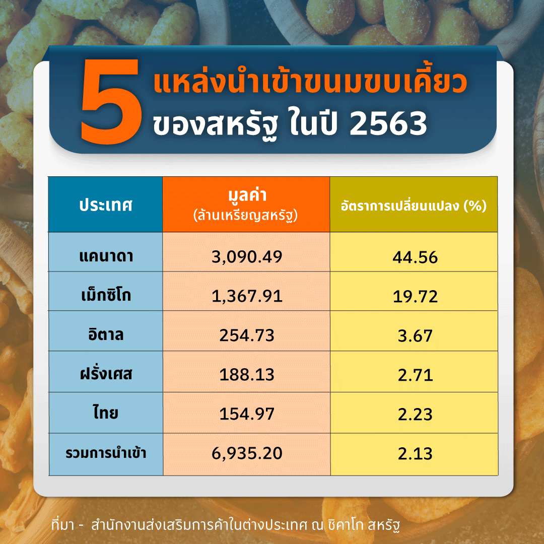 1 ใน 5 แหล่งนำเข้าขนมขบเคี้ยวหลักของสหรัฐฯ โดยครองส่วนแบ่งการนำเข้าประมาณ