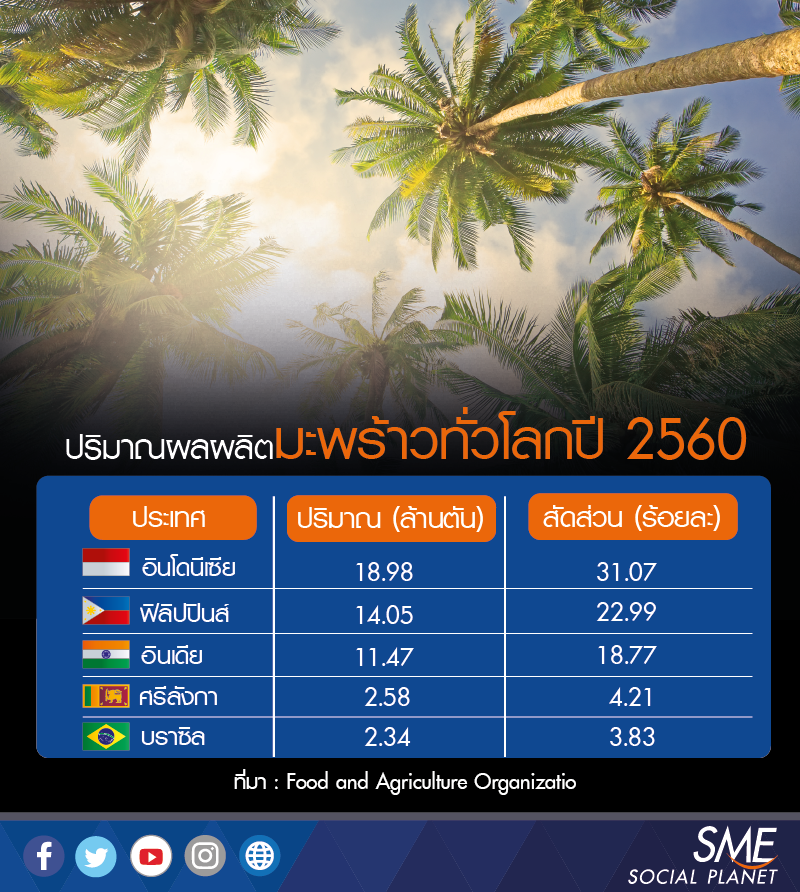 อย่างไรก็ตาม ปัจจุบันฟิลิปปินส์มีพื้นที่เพาะปลูกมะพร้าวมากสุดในโลก (ประมาณร้อยละ 29.28 ของ พื้นที่เพาะปลูกทั้งหมด) แต่อินโดนีเซียกลับสามารถผลิตมะพร้าวได้ปริมาณมากที่สุดในโลก สำหรับประเทศไทยนั้นถือเป็นผู้ผลิตมะพร้าวอันดับที่ 9 ของโลกโดยมีพื้นที่เพาะปลูกทั้งสิ้น 1.92 แสนเฮกตาร์ (1.2 ล้านไร่) สามารถผลิตมะพร้าวได้ประมาณ 8.95 แสนตันต่อปี