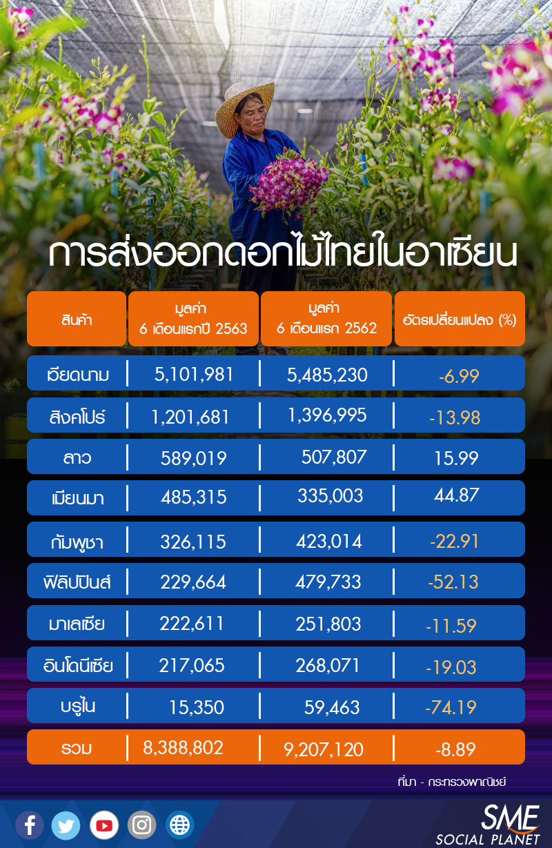 ข้อมูลจากกระทรวงพาณิชย์ ระบุว่าในช่วงครึ่งแรก (มกราคม-มิถุนายน) ของปี 2563 ไทยส่งออกดอกไม้มูลค่า 46.8