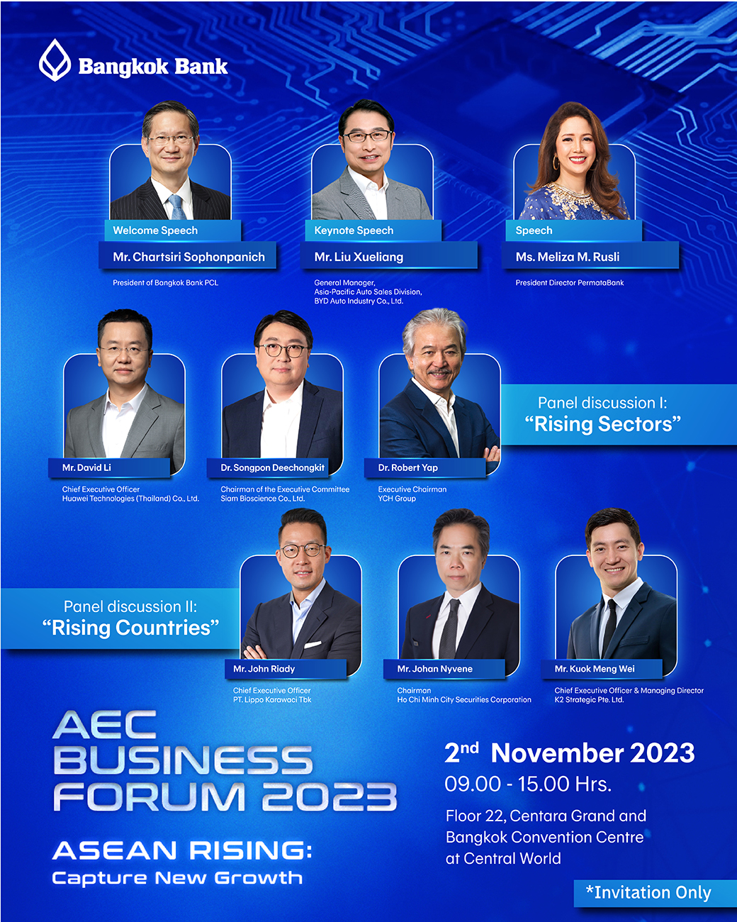 ทั้งนี้ งานสัมมนาใหญ่ประจำปี AEC Business Forum 2023 ครั้งที่ 5 หัวข้อ “ASEAN Rising : Capture New Growth” จะจัดขึ้นในวันพฤหัสบดีที่ 2 พฤศจิกายน 2566 เวลา 10.00 – 15.00 น. ณ บางกอกคอนเวนชันเซ็นเตอร์ ชั้น 22 โรงแรมเซ็นทาราแกรนด์ แอท เซ็นทรัลเวิลด์ ทั้งนี้ ขอสงวนสิทธิ์สำหรับผู้ได้รับเชิญและลงทะเบียนสำรองที่นั่งล่วงหน้าเท่านั้น (BY INVITATION ONLY)