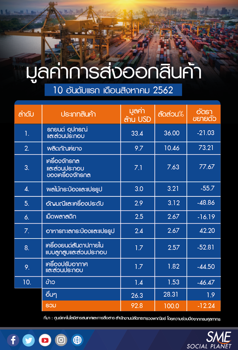 สินค้าส่งออก 10 อันดับแรก มีสัดส่วนกว่าร้อยละ 70 ของมูลค่าการส่งออกทั้งหมด โดยรถยนต์ อุปกรณ์ และ ส่วนประกอบ ยังคงเป็นกลุ่มสินค้าส่งออกอันดับหนึ่งของไทย เมื่อเทียบกับเดือนเดียวกันของปีที่ผ่านมา พบว่ามีการเติบโตเป็นลบร้อยละ 21 ด้วยมูลค่ารวม 33.4 ล้านดอลลาร์สหรัฐ ในจำนวนนี้ส่วนใหญ่มาจากรถยนต์นั่งคิดเป็นมูลค่า 16.63 ล้านดอลลาร์สหรัฐ ตามมาด้วยส่วนประกอบและอุปกรณ์รถยนต์อีก 10.16 ล้านดอลลาร์สหรัฐ ที่เหลืออีก 6.63 ล้านดอลลาร์สหรัฐเป็นรถปิคอัพ