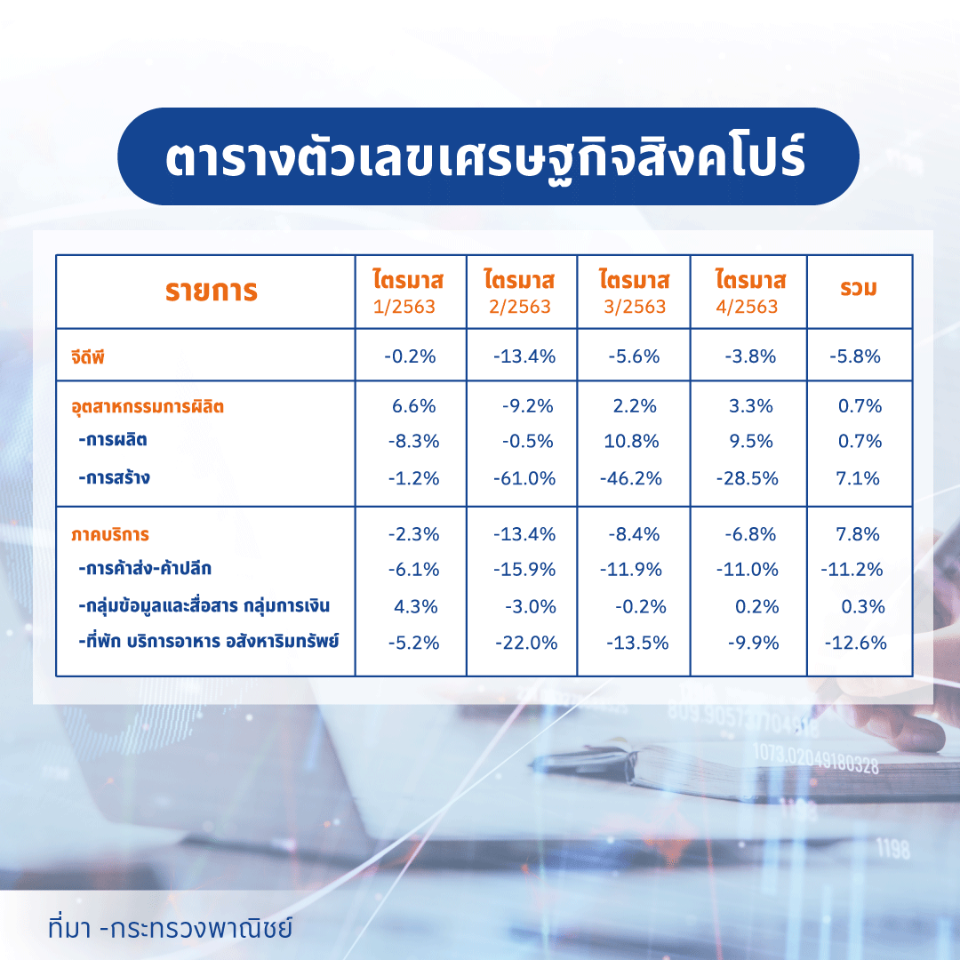 ปี 2563 ที่ผ่านมาถือเป็นปีที่หนักหน่วงสำหรับสิงคโปร์ ที่ต้องพยุงเศรษฐกิจฝ่าวิกฤตโควิด 19 อย่างทุลักทุเล โดยอัตราการขยายตัวทางเศรษฐกิจ (จีดีพี) หดตัว 5.8% สูงสุดนับตั้งแต่ได้รับเอกราชมาเมื่อปี 2508 และรุนแรงกว่ายุควิกฤตเศรษฐกิจต้มยำกุ้ง