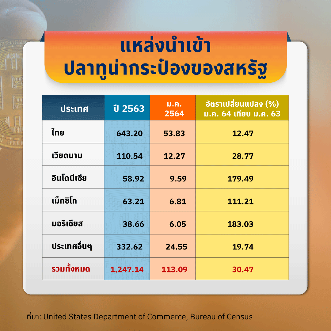 หากเจาะลึกลงไปที่ตลาดสหรัฐฯ จะพบว่า ปลาทูน่ากระป๋องเป็นสินค้าที่ผู้บริโภคชาวอเมริกันให้ความนิยมเป็นอันดับ 3 รองจากกุ้งและปลาแซลมอน โดยปกติชาวอเมริกันจะบริโภคปลาทูน่ากระป๋องเฉลี่ย 2.1 ปอนด์ต่อคนต่อปี แม้ว่าในปี 2563 จะประสบปัญหาการแพร่ระบาดของโควิด แต่ยังนำเข้าสินค้ากลุ่มปลาทูน่าเพิ่มขึ้น 4.29% โดยเฉพาะปลาทูน่ากระป๋องเพิ่มขึ้นถึง 13.8%