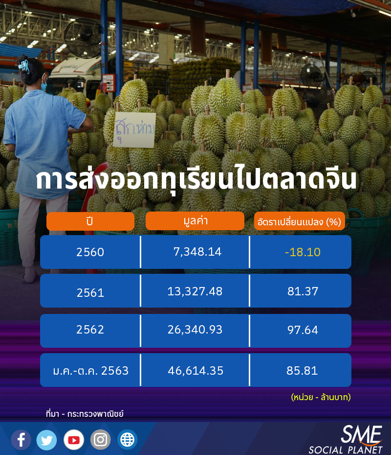 จีนเป็นตลาดส่งออกทุเรียนอันดับ 1 ของไทย โดยในปี 2561 ไทยส่งออกทุเรียนไปยัง 48 ประเทศทั่วโลก ปริมาณรวม 490 ล้านกิโลกรัม ซึ่งในจำนวนนี้เกินครึ่งเป็นการส่งออกไปยังตลาดจีน ปริมาณมากถึง 343 กิโลกรัม