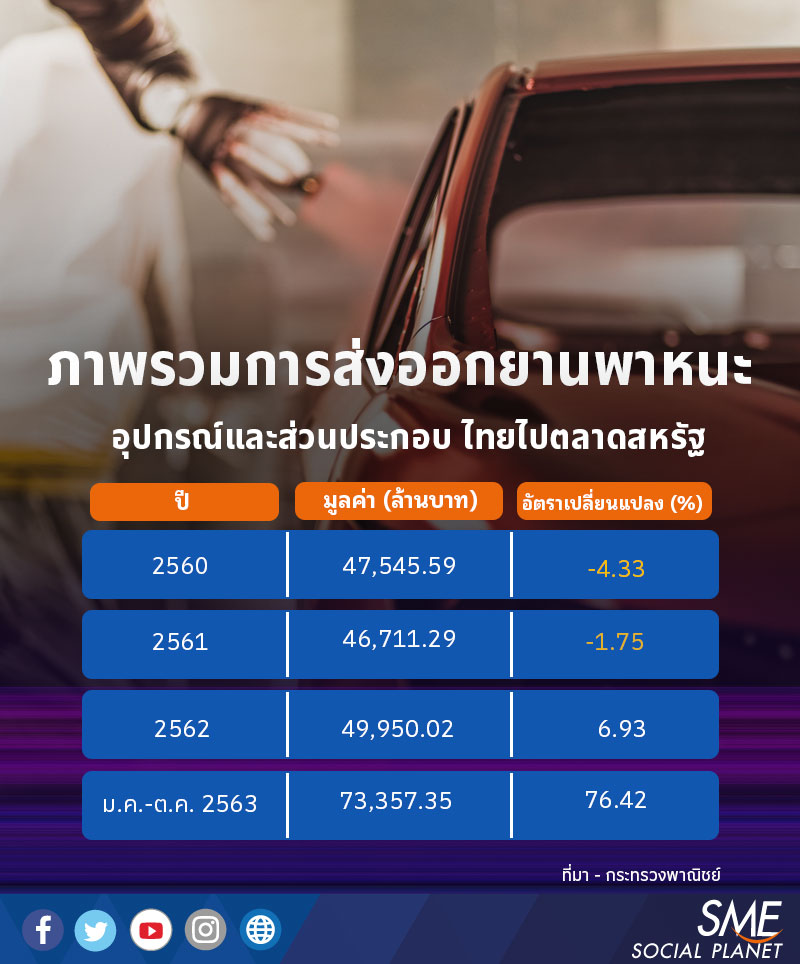 ของมูลค่าการส่งออกทั้งหมดของไทย และในช่วง 8 เดือนแรกของปี 2563 สหรัฐฯ นำเข้าสินค้ากลุ่มรถยนต์และชิ้นส่วนรถยนต์จากไทยเป็นมูลค่า