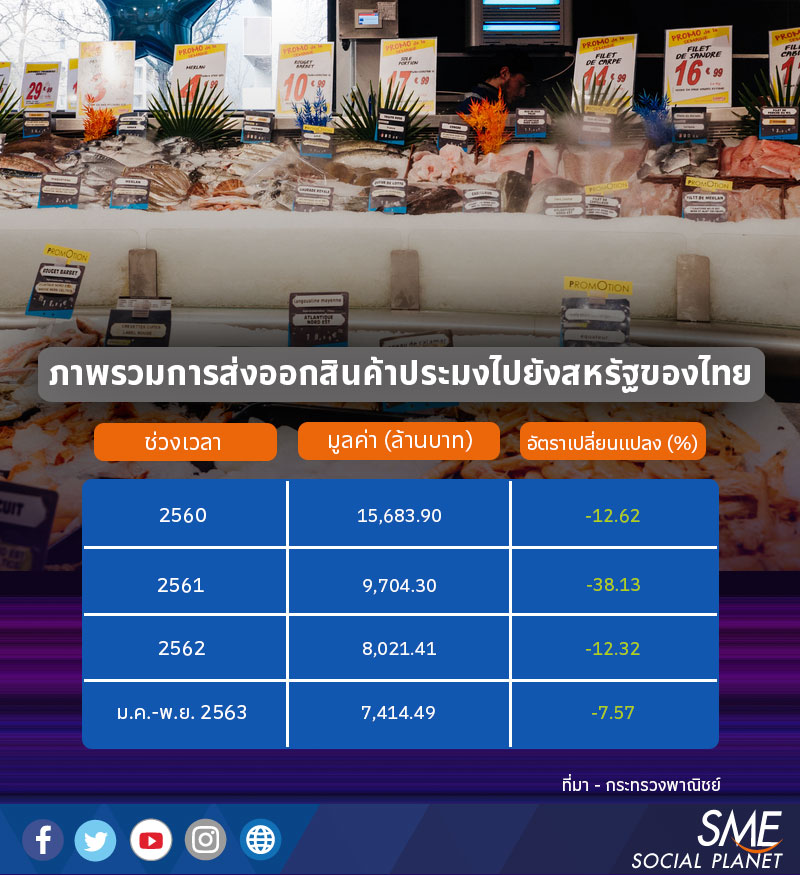 อย่างไรก็ตามอีกด้านหนึ่งพบว่าปริมาณการนำเข้าสินค้ากลุ่มนี้ของสหรัฐในช่วง 10 เดือนแรก มีมูลค่า 13,800 ล้านเหรียญสหรัฐ ลดลง 5.15% เมื่อเทียบกับช่วงเดียวกันของปีก่อน โดยในส่วนการนำเข้าสินค้าจากไทยก็ลดลงตามไปด้วย ซึ่งนั่นเป็นผลสะท้อนจากการใช้มาตรการล็อกดาวน์ ทำให้ธุรกิจบริการร้านอาหาร หรือฟู้ดเซอร์วิสหยุดไปในช่วงก่อนหน้านี้ แต่ก็ยังพบว่ามีสินค้าอาหารทะเลบางชนิดที่สามารถส่งออกไปได้เพิ่มขึ้น เช่น ปลาแช่แข็ง ซึ่งนับว่าเป็นโอกาสในอนาคต