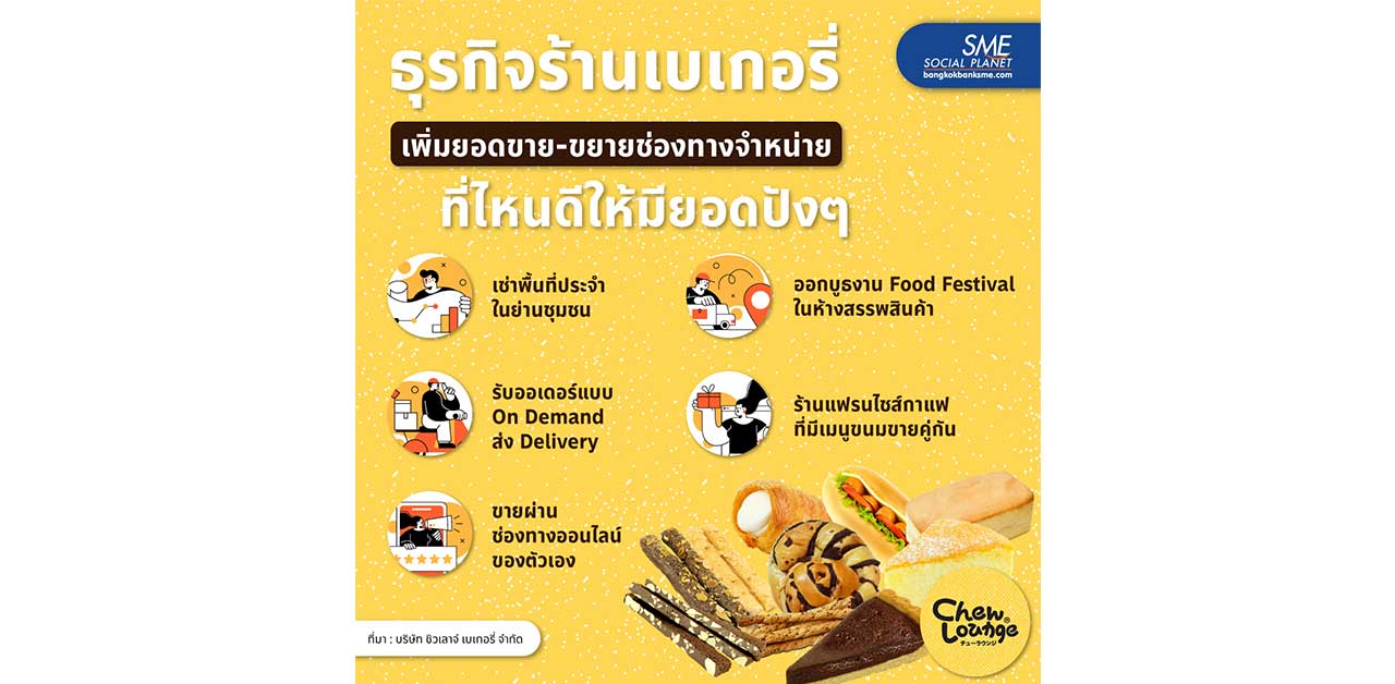 ธุรกิจร้านเบเกอรี่ เพิ่มยอดขาย-ขยายช่องทางจำหน่ายที่ไหนดีให้มียอดปังๆ Case Study ที่มีแนวคิดน่าสนใจอย่างบริษัท ชิวเลาจ์ เบเกอรี่ จำกัด ธุรกิจผู้ผลิตเบเกอรี่แห่งเมืองย่าโม ทั้งในรูปแบบขายปลีกและขายส่งทั้งในห้างสรรพสินค้า ไฮเปอร์มาร์เก็ต และร้านกาแฟ Amazon กว่า 400 สาขาในปัจจุบัน เผยว่า เริ่มรู้จักกับคำว่า ‘ช่องทางจำหน่าย’ มากขึ้นก็ตอนที่น้องชายมาบอกว่าได้จองพื้นที่ขายของเป็นล็อคเล็ก ๆ ในงาน Food Festival ในห้างฯ วันแรกขายได้ 5 พันกว่าบาท จากปกติที่ขายได้วันละ 2-3 พันบาท