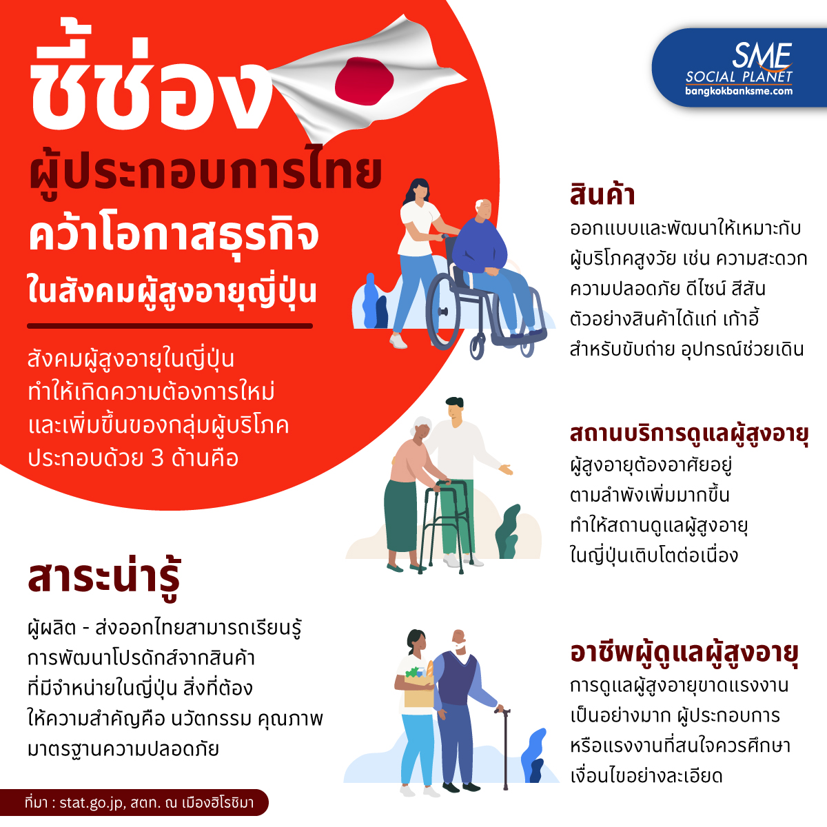 มองเป็นเห็นโอกาสซ่อนอยู่! ประเทศญี่ปุ่นมีอัตราผู้สูงอายุ (Rate of Aging) สูงที่สุดในโลก โดยมีการคาดการณ์ว่าผู้สูงอายุจะมีจำนวนพุ่งสูงขึ้นถึงร้อยละ 35 ภายในประมาณปี 2040 ด้วยเหตุนี้ Bangkok Bank SME จึงขอนำการเปลี่ยนแปลงไปสู่สังคมผู้สูงอายุ จะเกิดความต้องการใหม่และเพิ่มขึ้นของกลุ่มผู้บริโภค 3 ด้านคือ..