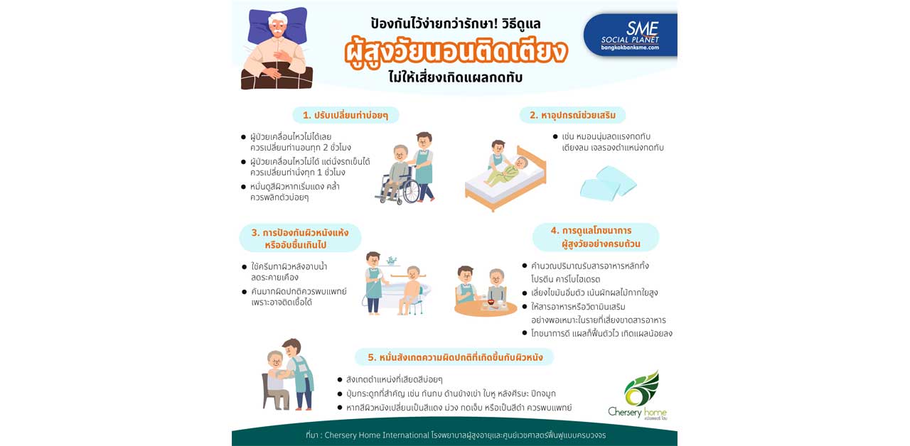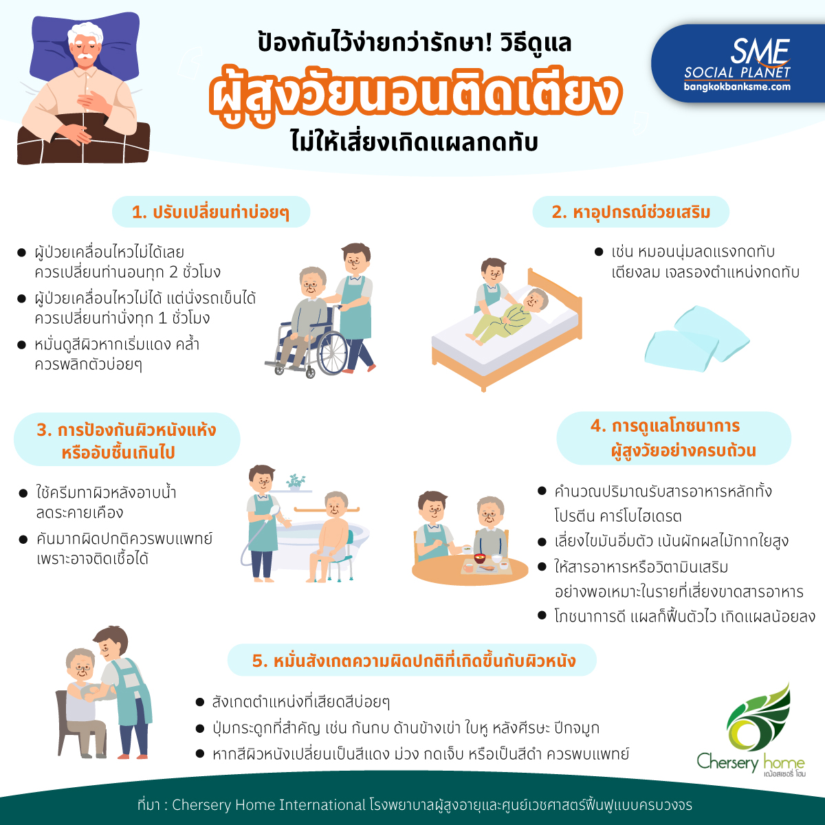 ผู้สูงวัยที่ไม่สามารถช่วยเหลือตัวเองได้ มีปัญหาเรื่องการนอนติดเตียง มักมีปัญหาขาดสารอาหารจนร่างกายซูบผอมลง จนเกิดมีปุ่มกระดูกชัด ผิวหนังแห้งขาดความชุ่มชื้นและมีภาวะโรคร่วมอย่างอื่นที่มีความเสี่ยงทำให้เกิดแผลกดทับได้ เช่น เบาหวานแผลอักเสบติดเชื้อง่าย ภาวะเส้นเลือดที่ปลายแขนขาที่ไม่ดี ความชื้นของอากาศก็เป็นปัญหาได้เช่นกัน วันนี้ ‘Chersery Home’ มี 5 วิธีป้องกัน การเกิดแผลกดทับมาฝากกัน