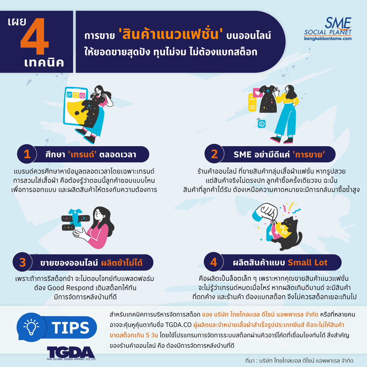 การขายสินค้าแนวแฟชั่น ให้ประสบความสำเร็จ เคล็ดลับคือ ต้องศึกษาหาข้อมูลตลอดเวลา โดยเฉพาะเทรนด์การสวมใส่เสื้อผ้า คือต้องรู้ว่าตอนนี้ลูกค้าวัยรุ่นชอบแบบไหน เพื่อการออกแบบสินค้าให้ตรงกับความต้องการ สิ่งที่ทำให้การเติบโตของ บริษัท ไทยโกลบอล ดีไซน์ แอพพาเรล จำกัด เป็นแบบก้าวกระโดด