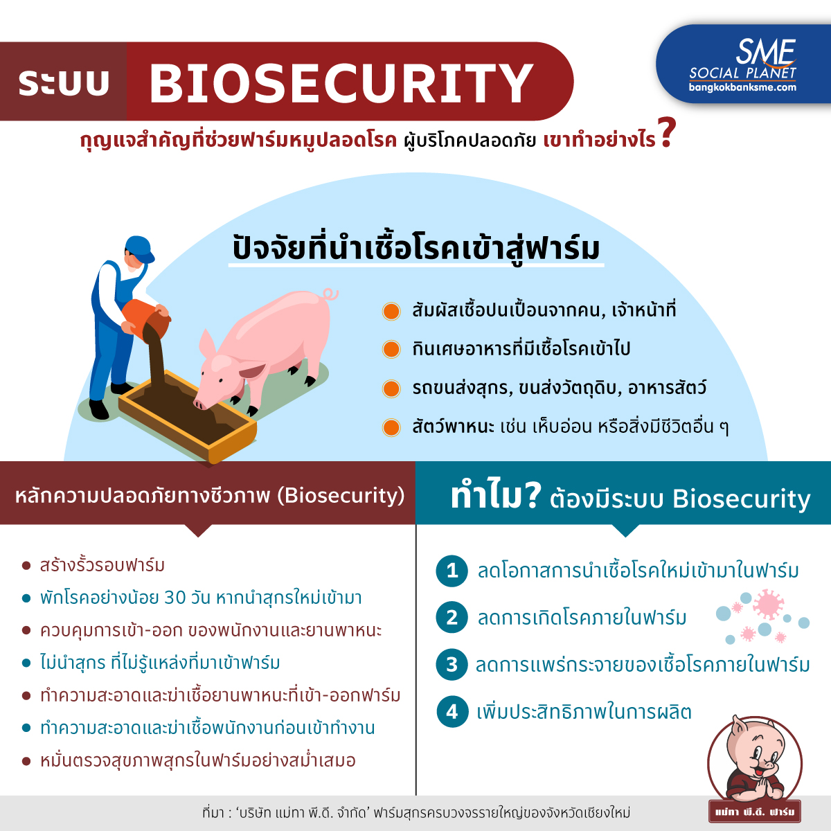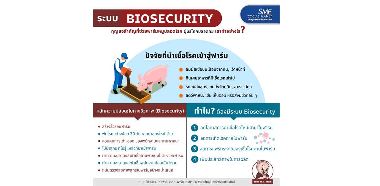 คงปฏิเสธไม่ได้ว่าโรคแอฟริกันสไวน์ฟีเวอร์ หรือที่เรียกกันสั้น ๆ ว่า โรค ASF สร้างความเสียหายให้ธุรกิจฟาร์มสุกรอย่างมหาศาล จึงต้องมีมาตรการป้องกันการติดเชื้อที่ดี อย่างเช่น ‘บริษัท แม่ทา พี.ดี. จำกัด’ ที่ใช้ระบบความปลอดภัยทางชีวภาพ หรือ Biosecurity มาช่วยสร้างมาตรฐานให้กับฟาร์มสุกรได้อย่างมีประสิทธิภาพ ทำให้ได้เนื้อสุกรที่ดีมีคุณภาพ เขามีระบบการจัดการอย่างไร ? เรารวบรวมไว้ใน อินโฟกราฟิกนี้แล้ว