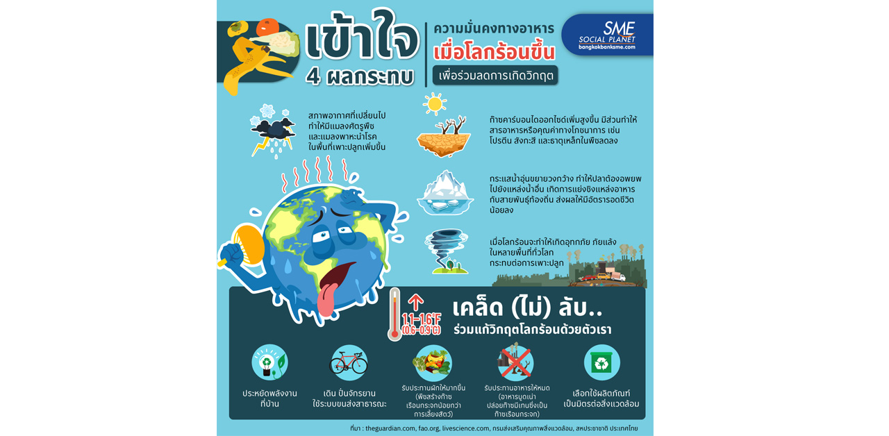 Bangkok Bank SME ขอนำ 4 ผลกระทบมาสร้างความเข้าใจของเหตุและผลจากการเกิด Global Warming เพื่อที่พวกเราจะได้ร่วมด้วยช่วยกันลดการเกิดวิกฤต ไม่ทำให้โลกร้อนสร้างปัญหาให้กับมวลมนุษยชาติมากกว่าที่เป็นอยู่