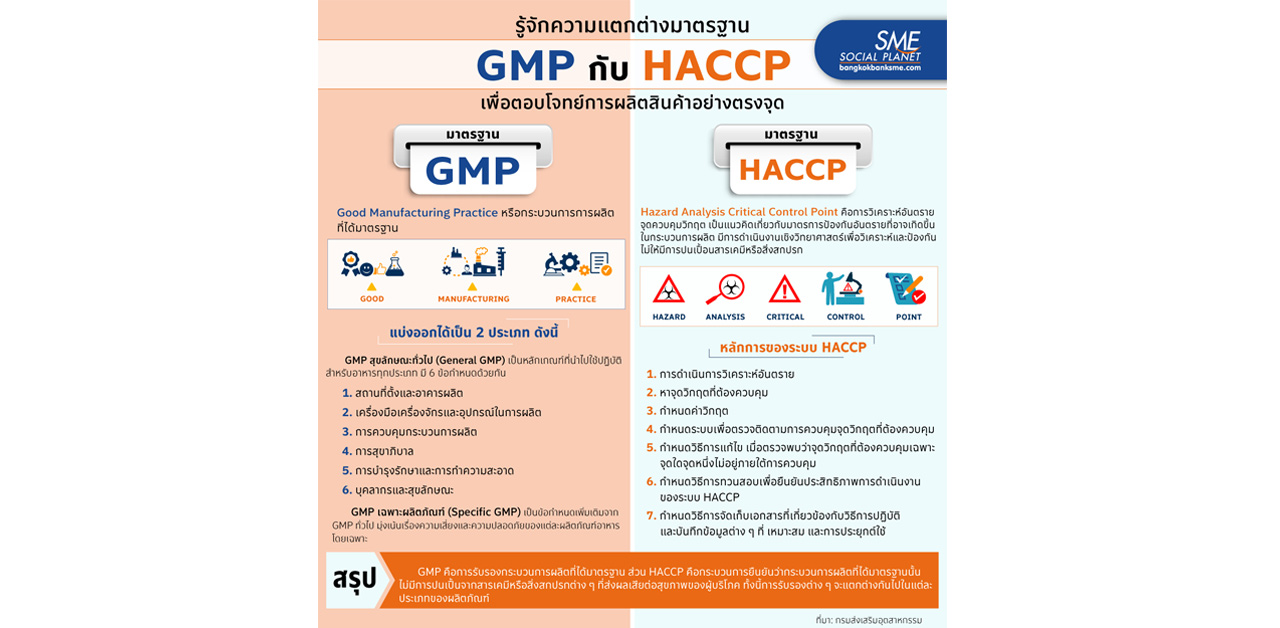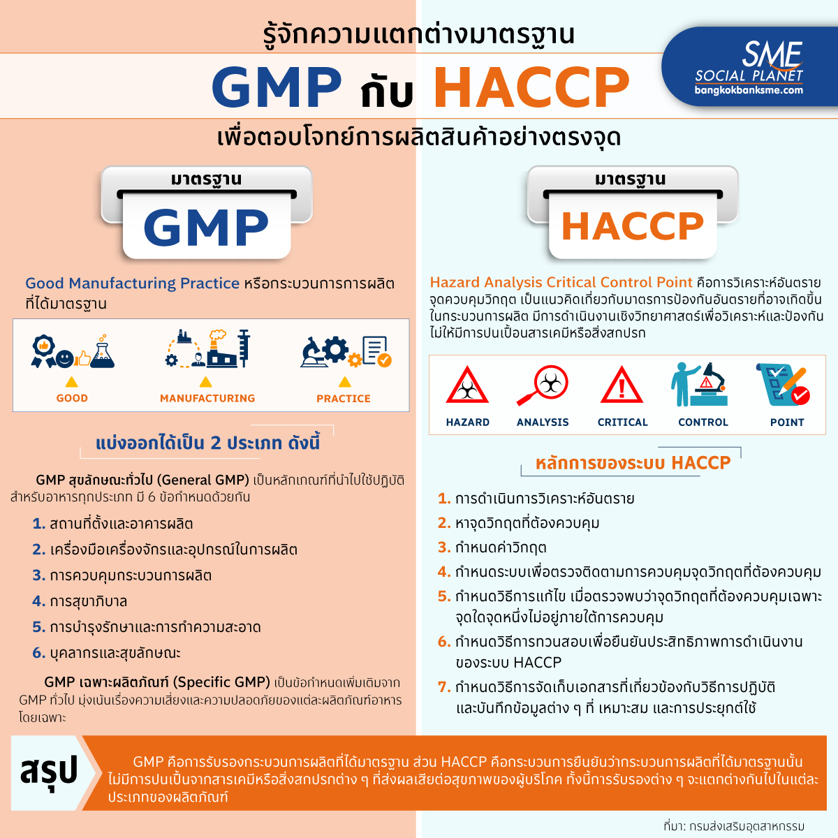 ทั้งมาตรฐาน GMP และ HACCP คือสแตนดาร์ดที่ได้รับการยอมรับทั้งในเมืองไทยและต่างประเทศ ช่วยสร้างความเชื่อมั่นให้กับผู้บริโภค ซึ่งทั้ง 2 มาตรฐานแม้จะเป็นมาตรฐานในการผลิตสินค้าคุณภาพแต่ยังมีจุดแตกต่างกันอยู่ จึงเป็นเรื่องที่ผู้ประกอบการ SME ควรทำความเข้าใจ เพื่อตอบโจทย์มาตรฐานที่จำเป็นต้องใช้ในการผลิตสินค้าอย่างตรงจุด
