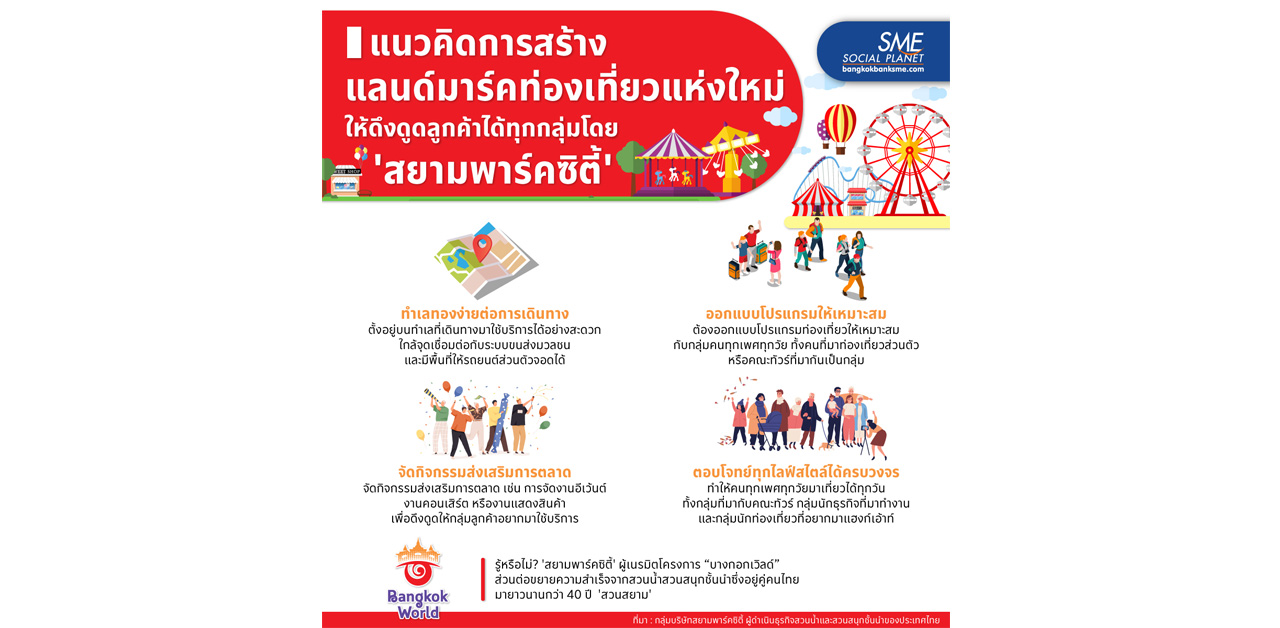 ซึ่งธุรกิจนี้จะประสบความสำเร็จได้ต้องมีองค์ประกอบที่สำคัญ เพื่อดึงดูดให้คนเข้ามาใช้บริการมากที่สุด เช่นเดียวกับ ‘'สยามพาร์คซิตี้' เจ้าของโครงการ ‘บางกอกเวิลด์’ ที่สร้างส่วนต่อขยายความสำเร็จจากสวนน้ำสวนสนุกชั้นนำซึ่งอยู่คู่คนไทย