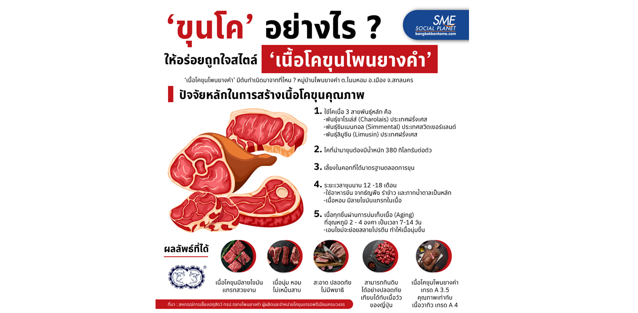 หนึ่งในสุดยอดเนื้อวัวของไทย ที่ได้รับการยอมรับของสายเนื้อ ต้องมีชื่อ ‘เนื้อโคขุนโพนยางคำ’ ติดอันดับอยู่ในใจใครหลายคนแน่นอน ซึ่งเนื้อระดับพรีเมียมนี้ เป็นของ สหกรณ์การเลี้ยงปศุสัตว์ กรป. กลาง โพนยางคำ ที่มีประวัติยาวนานกว่า 40 ปี เขามีเคล็ดลับอย่างไร ? ถึงทำให้ ‘เนื้อโคขุนโพนยางคำ’ มีรสชาติที่เป็นเอกลักษณ์ นุ่มหอม ไม่เหมือนใคร Bangkok Bank SME มีคำตอบ