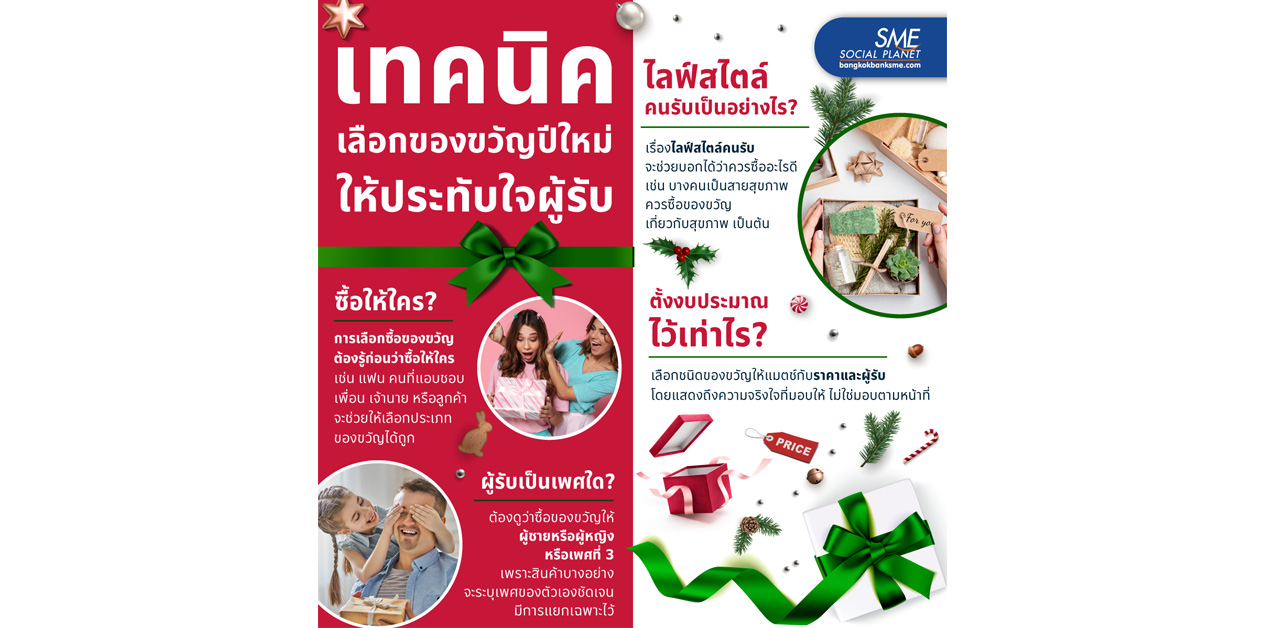 อีกไม่กี่วันก็จะถึงเทศกาลปีใหม่ 2566 แล้ว อีกหนึ่งกิจกรรมที่ได้รับความนิยมก็คือ ‘การมอบของขวัญ’ แทนใจ ซึ่งการซื้อของขวัญไม่ใช่ว่าเราจะซื้อสิ่งใดแล้วถูกใจผู้รับเสมอไป ดังนั้น Bangkok Bank SME จึงขอนำเทคนิคการเลือกของขวัญมาให้ได้ทราบ เพื่อเป็น Gift 2566 เป็นที่ถูกใจทั้งผู้ให้และผู้รับมาฝาก