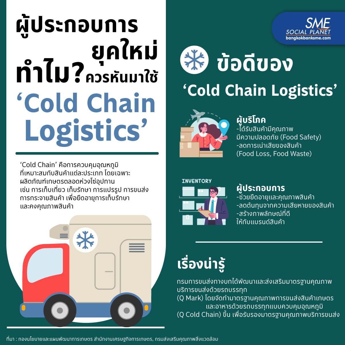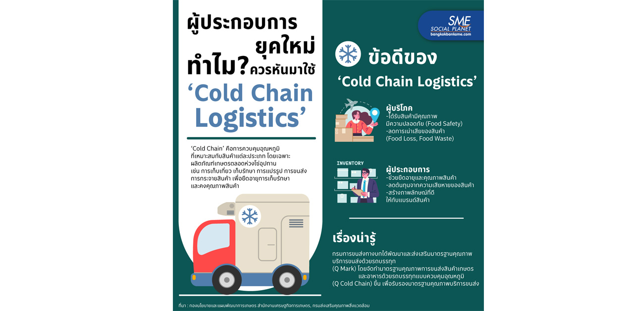 ปัจจุบันภาคธุรกิจได้มีการใส่ใจในการส่งสินค้าไปยังมือผู้บริโภคอย่างสมบูรณ์และมีคุณภาพมากขึ้น จึงเป็นเหตุผลให้ ‘Cold Chain Logistics’ ได้รับความนิยมเพิ่มขึ้นต่อเนื่อง ซึ่งการขนส่งประเภทนี้มีข้อดีอะไรบ้าง ทำไม? ผู้ประกอบการยุคใหม่ควรหันมาใช้ ‘Cold Chain Logistics’ Bangkok Bank SME มีคำตอบ..