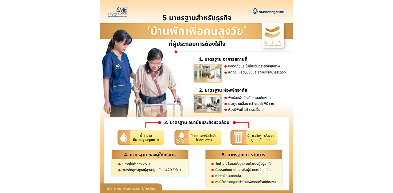 และประกาศของกระทรวงสาธารณะสุขที่ให้ผู้ประกอบกิจการรายใหม่ทุกราย ต้องขออนุญาตก่อนเปิดกิจการ ผู้ให้บริการหรือพนักงานทุกรายที่ทำหน้าที่ดูแลผู้สูงอายุต้องผ่านการอบรม จบจากหลักสูตรรับรอง รวมทั้ง 5 มาตรฐานหลัก ๆ ที่ผู้ประกอบการต้องให้ความสำคัญ โดยมีหลักสำคัญคือ ‘ความปลอดภัย’ ของใช้บริการ