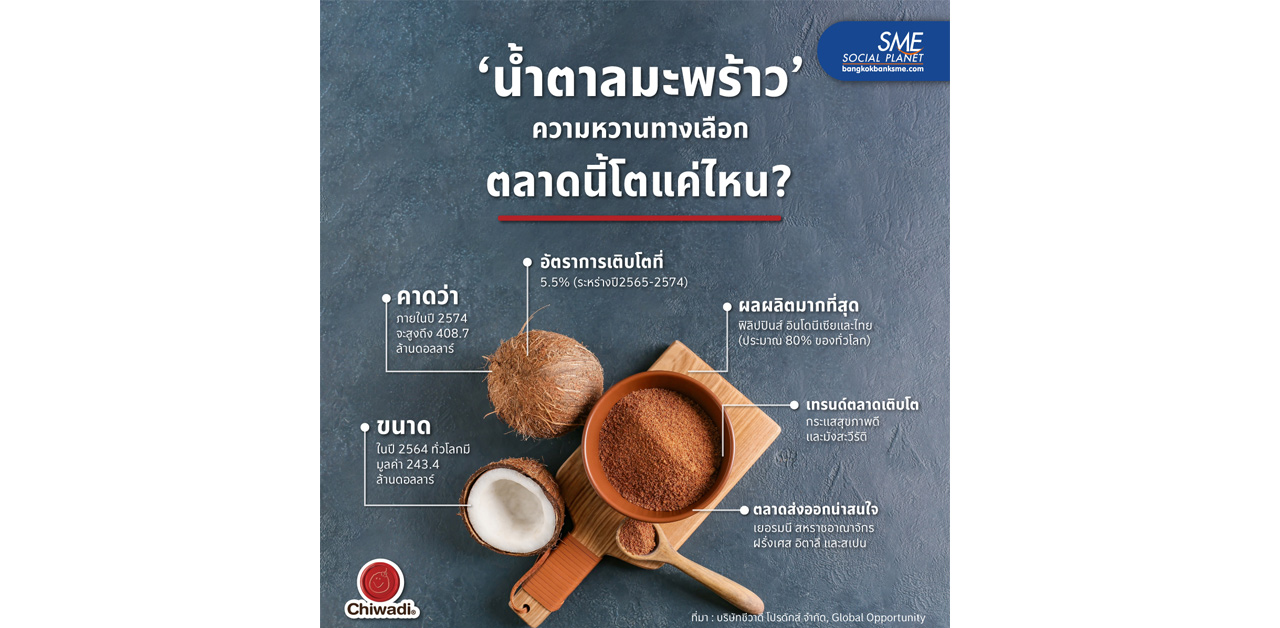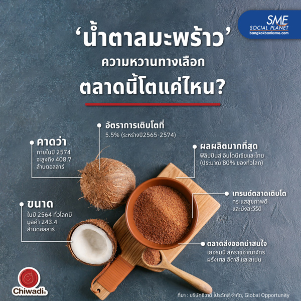 ตลาดกำลังโต! คงไม่มีใครไม่รู้จักน้ำตาลมะพร้าวซึ่งเป็นส่วนประกอบหลักของขนมไทยหลายชนิด แต่ทราบหรือไม่ว่า ปัจจุบันอุตสาหกรรมอาหารทั่วโลกต่างให้ความสนใจน้ำตาลมะพร้าวในแง่มุมของความหวานทางเลือกที่ดีต่อสุขภาพ อย่างเช่น บริษัทชีวาดี โปรดักส์ จำกัด ธุรกิจที่ได้มีการวิจัยและพัฒนาผลิตภัณฑ์ด้วยนวัตกรรมออกสู่ตลาดจนได้รับความสนใจสามารถส่งออกไปหลายประเทศทั่วโลก โดยเฉพาะอย่างยิ่งในยุโรปที่เติบโตไปพร้อมกับเทรนด์อาหารเพื่อสุขภาพและมังสะวิรัติ มาดูกันว่าตลาดนี้มีศักยภาพแค่ไหน