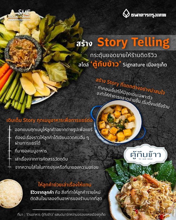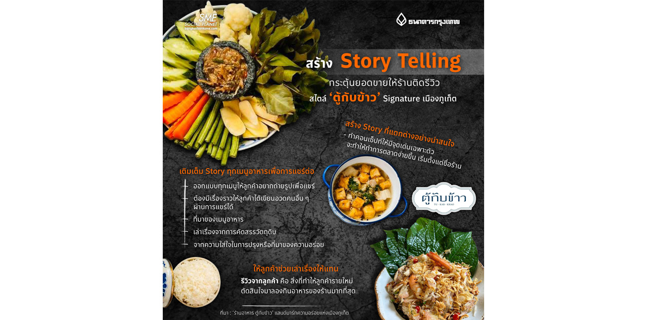 การเล่าเรื่องเป็นกลยุทธ์หนึ่งที่นอกเหนือจากการสร้างการจดจำแบรนด์ของเราแล้วยังทำให้แบรนด์มีคุณค่าและเกิดความผูกพันระหว่างเรากับลูกค้าได้อีกด้วย มีร้านอาหารจำนวนไม่น้อยให้ความสำคัญ กับการเล่าเรื่องราวหรือ Story Telling อย่างร้าน ‘ตู้กับข้าว’ Signature ความอร่อยแห่งเมืองภูเก็ต ที่ประสบความสำเร็จมาแล้วมากมาย
