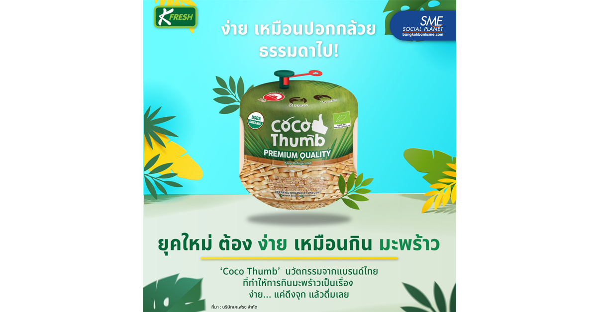 โดย K Fresh คือเจ้าของนวัตกรรมมะพร้าวน้ำหอมแท้ 100% ‘Coco Thumb’ ที่มีสลักบนจุก แค่ดึงแล้วดื่ม ง่าย ๆไม่ต้องเฉาะให้เปลืองแรง ดึงสลักแล้วดื่มได้เลย นวัตกรรมคนไทย ที่มาจากแนวคิดการตีโจทย์สำคัญ คือการทำให้ผู้บริโภค “ดื่มน้ำมะพร้าวสด ๆ จากลูก ได้ทุกที่ทุกเวลา”