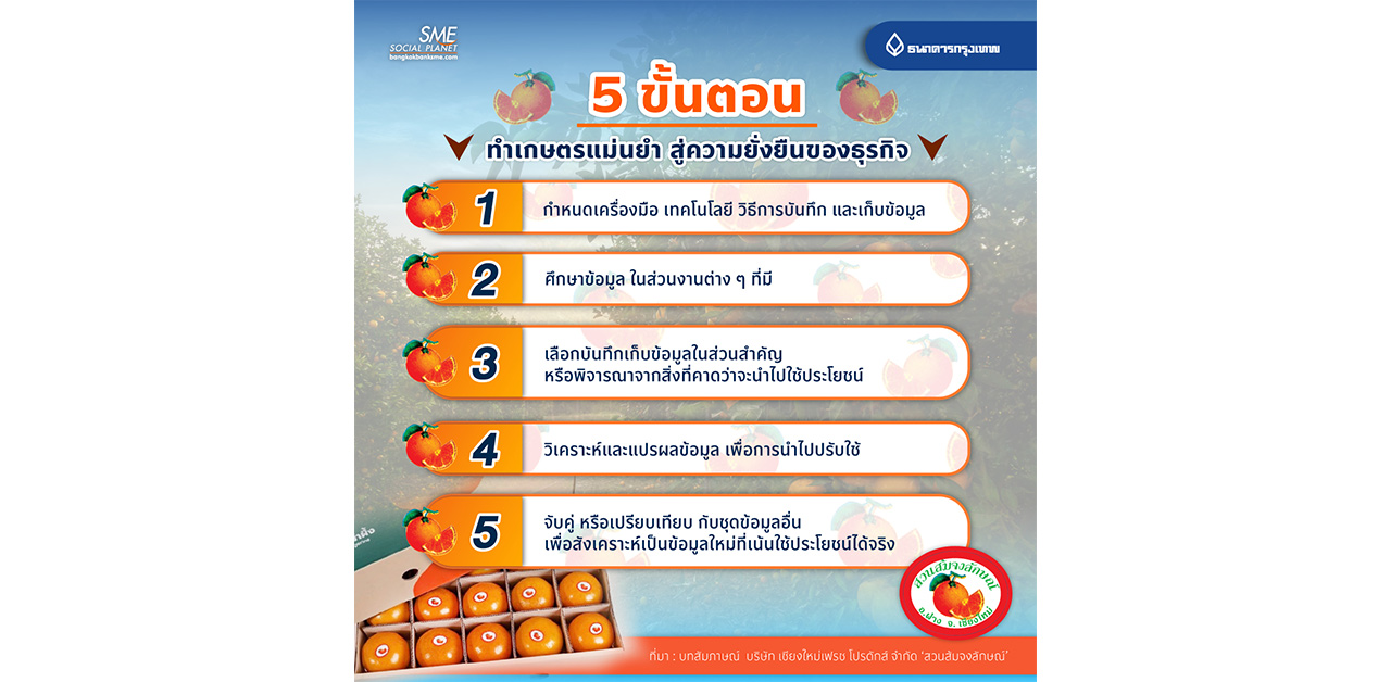 เพื่อเพิ่มปริมาณ หรือพัฒนาคุณภาพของผลผลิตให้สอดรับกับความต้องการของตลาด และมีความสามารถในการแข่งขันได้ เหตุนี้ การเก็บข้อมูลอย่างมีระบบเพื่อใช้เป็นฐานข้อมูล หรือ Big Data จึงเป็นประโยชน์มาก โดยมี 5 ขั้นตอนที่ผู้ประกอบการเกษตรสามารถนำไปปรับใช้ได้ดังนี้