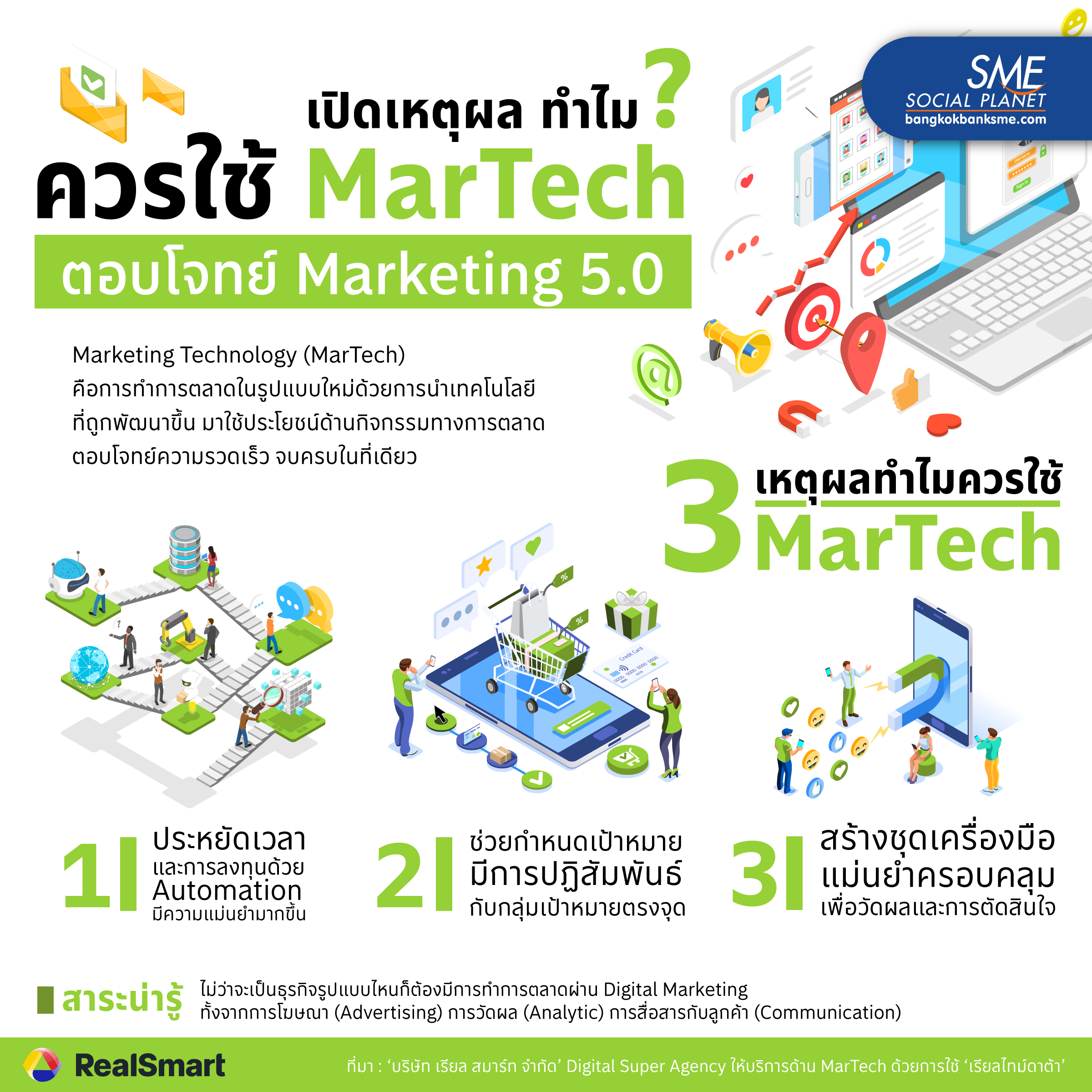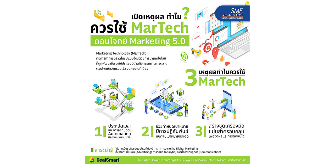 ในโลกธุรกิจนอกจากจะต้องมีสินค้าหรือบริการมากคุณภาพ เพื่อให้แต่ละบริษัทมียอดขายพุ่งแล้ว ยังมีปัจจัยอื่นที่จะช่วยให้กิจการประสบความสำเร็จด้วย เช่น การตลาดเพื่อดึงดูดผู้บริโภคให้มาซื้อสินค้าหรือใช้บริการ ดังนั้น MarTech จึงเป็นอีกหนึ่งเครื่องมือที่น่าสนใจอย่างยิ่ง ในยุค Marketing 5.0 เพราะแต่ละธุรกิจต่างเกี่ยวพันกับโลกดิจิทัล ซึ่ง MarTech จะช่วยรวบรวมดาต้าต่างๆ แล้วนำมาวิเคราะห์ เพื่อตอบโจทย์ความต้องการผู้บริโภคอย่างตรงจุด