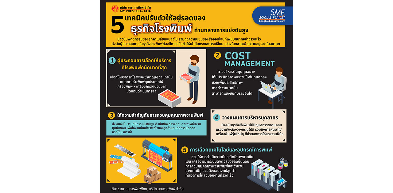 ดังนั้น Bangkok Bank SME จึงขอนำเสนอ 5 เทคนิคปรับตัว เพื่อให้ ‘ธุรกิจโรงพิมพ์ไทย’ ประสบความสำเร็จ - สามารถดำเนินกิจการต่อไปได้แม้เผชิญอุปสรรคด้านการแข่งขัน