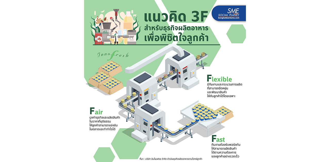 การทำธุรกิจรับผลิตอาหารตามโจทย์ความต้องการของลูกค้า สิ่งสำคัญคือทั้งผู้บริหารและพนักงานต้องมีวิสัยทัศน์และเป้าหมายไปในทิศทางเดียวกันเพื่อร่วมขับเคลื่อนธุรกิจ และสร้างการตอบสนองต่อความต้องการของลูกค้าให้ได้ เช่นเดียวกับ ‘บริษัท อินโนเฟรช จำกัด’ ที่มีจุดเด่นเรื่องความยืดหยุ่นในการพัฒนาสินค้า ความรวดเร็ว และความยุติธรรม ทำให้ลูกค้ามีความเชื่อมั่นและเลือกใช้บริการ จนสามารถแข่งขันในตลาดได้อย่างมีประสิทธิภาพ