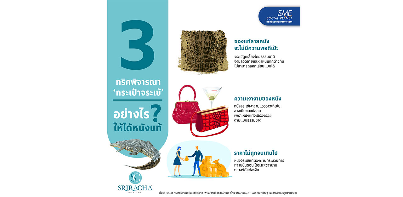 สำหรับท่านใดที่มีความชมชอบผลิตภัณฑ์จากหนังจระเข้ Bangkok Bank SME มี 3 เทคนิคสังเกต ‘กระเป๋าจระเข้’ อย่างไร? ให้ได้หนังแท้ จาก ‘บริษัท ศรีราชาฟาร์ม (เอเชีย) จำกัด’ ฟาร์มจระเข้แถวหน้าเมืองไทย มาให้ได้ทราบ เพื่อที่การซื้อกระเป๋าแสนรักเป็นไปด้วยความสบายใจไม่ถูกย้อมแมว
