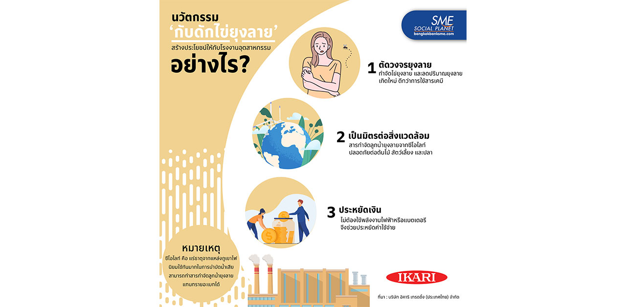 กับดักไข่ยุงลาย มีขั้นตอนการทำงาน โดยจะล่อให้ยุงลายมาวางไข่ด้วยสารสกัดจากหอยลายที่มีอัตราการดึงดูดให้ยุงลายมาวางไข่ได้มากกว่าในภาชนะทั่วไปถึง 2 เท่า เมื่อไข่ยุงฟักออกมาก็จะถูกกำจัดด้วยสารซีโอไลท์ ซึ่งการใช้กับดักไข่ยุงลายแบบนี้ จะสามารถลดปริมาณยุงลายได้อย่างน้อยสัปดาห์ละ 500 ตัว อีกทั้งยังช่วยลดการใช้สารเคมีที่เป็นอันตราย และยังเป็นมิตรกับสิ่งแวดล้อม ซึ่งนวัตกรรมนี้จาก ‘บริษัทอิคาริ เทรดดิ้ง (ประเทศไทย) จำกัด’ ได้มีภาคประชาชนและหลายหน่วยงานนำไปใช้งานอย่างแพร่หลาย